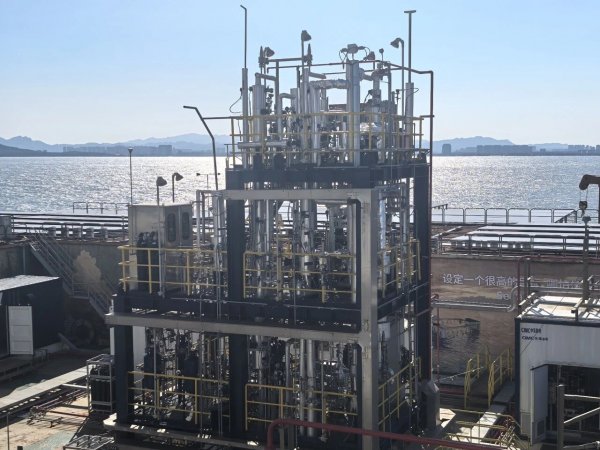 本次投运的甲醇合成撬块采用高度集成化的撬装设计,具备部署高效、占地集约、适应海洋复杂环境等突出优势。集成的核心甲醇合成技术实现了低至6.9MPaG的合成压力,二氧化碳单程转化率超过80%,能够将海上可再生能源制备的绿氢与捕集的二氧化碳高效、稳定地转化为绿色甲醇。